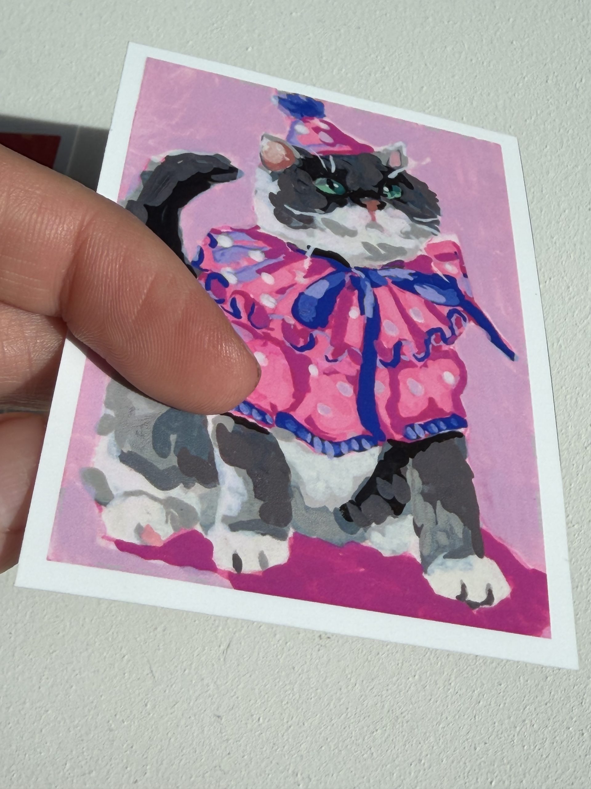 This listing is for one ACEO sized print (2.5×3.5″) that has been printed on fine art Luster paper. The Luster paper helps capture the rich detail and depth of colors to help closely match the original painting. This print is a reproduction of my Clown Kitty ACEO