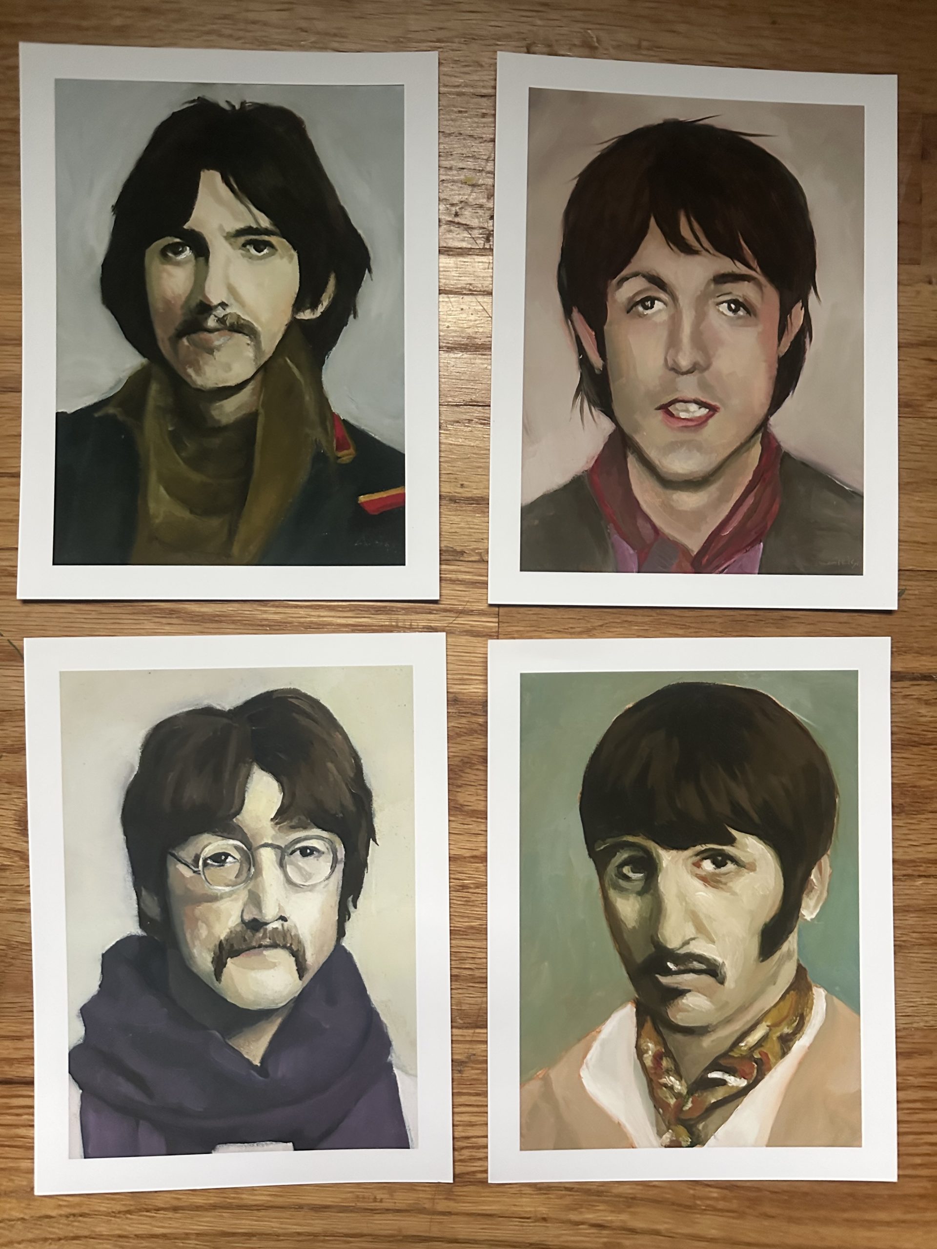 This is a set of four prints featuring my original oil portraits of the Beatles—John, Paul, George, and Ringo. Each one was painted with a whole lot of love for their music and the stories their faces seem to tell. I tried to capture more than just a likeness—something of their mood, their energy, their presence.