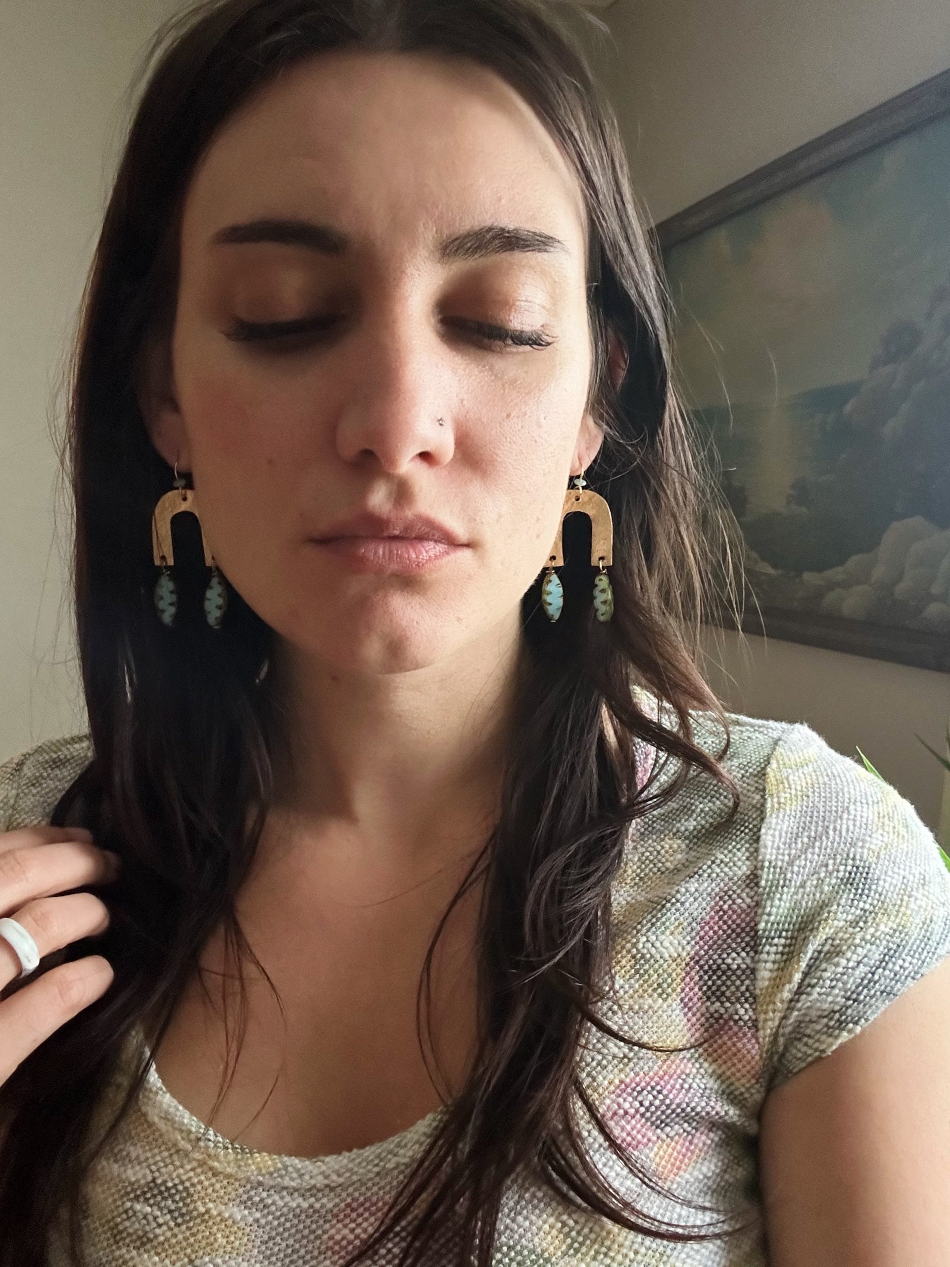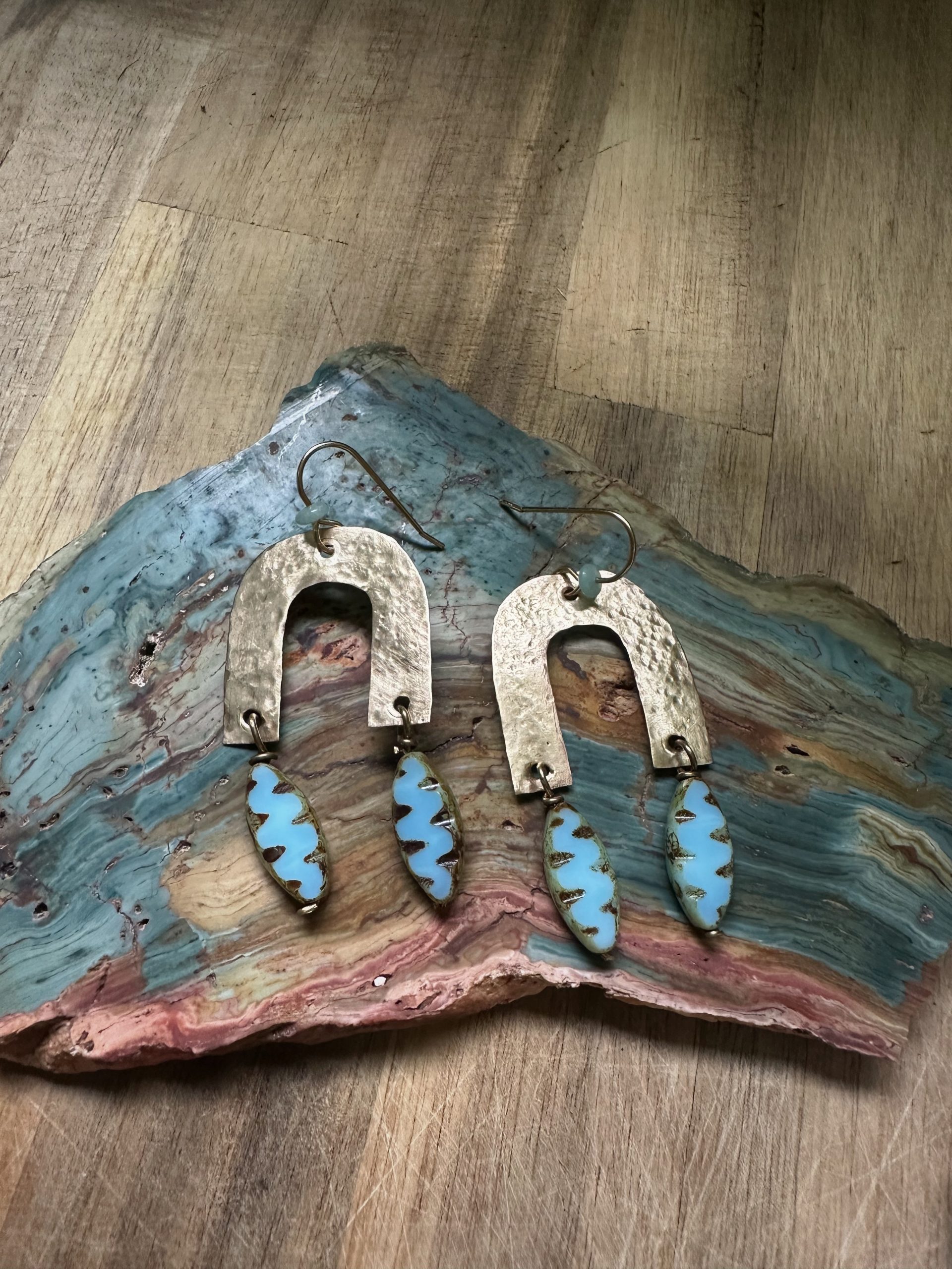 These bold yet playful earrings are handcrafted from warm, hammered brass and accented with stunning Czech glass beads. The soft arch shape gives a sculptural presence, while the vibrant blue-and-olive glass drops add a touch of whimsy and rustic charm. A frosted glass bead at the ear wire ties it all together with an organic finish.