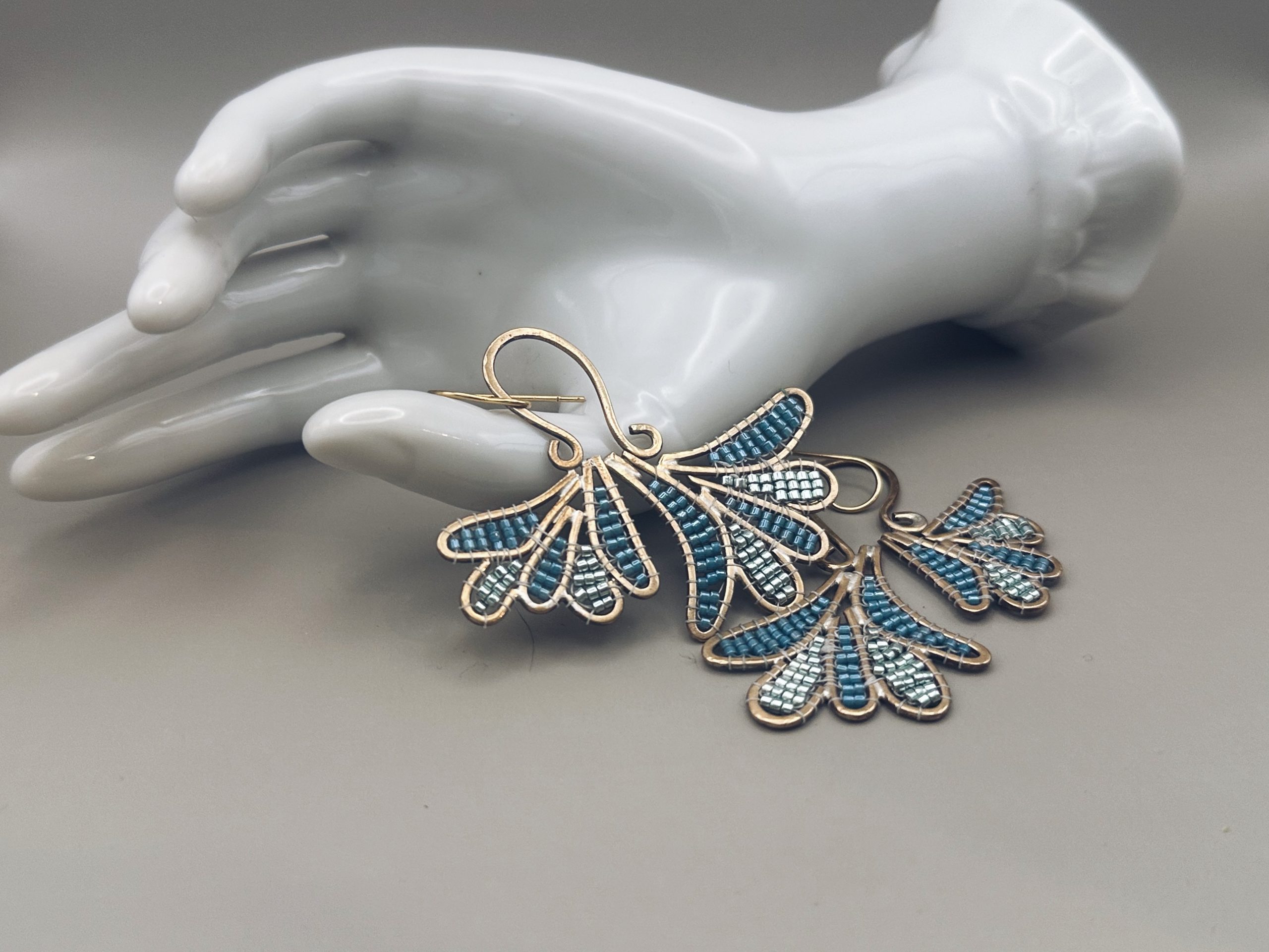 These elegant statement earrings feature hand-bent brass in a fan shaped floral design, carefully soldered and filled with a stunning blend of dark and light blue delica beads. Each petal is meticulously woven, creating a shimmering mosaic of deep indigo and brass hues that catch the light with every movement.