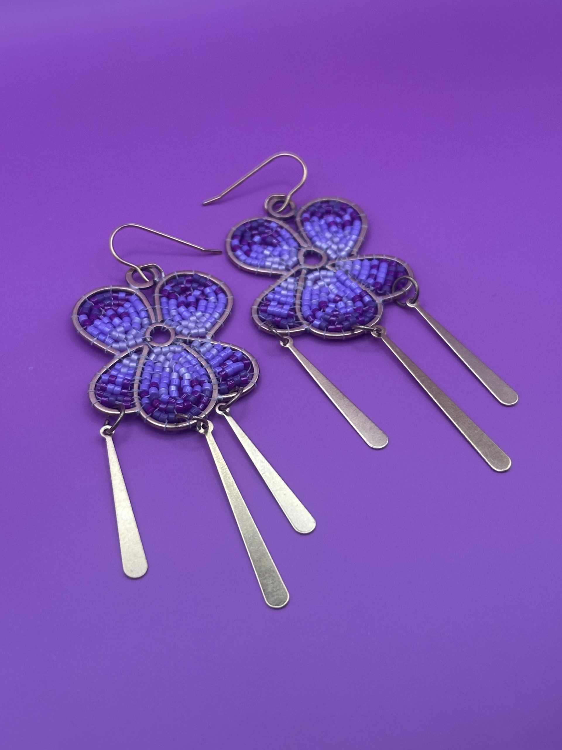Inspired by tender memories of little hands offering freshly picked wild violets from the yard, these earrings are a tribute to the simple, fleeting treasures of motherhood. Hand-formed from brass and delicately soldered, each flower is carefully woven with violet-hued Delica beads—capturing the gentle beauty of those tiny blooms.