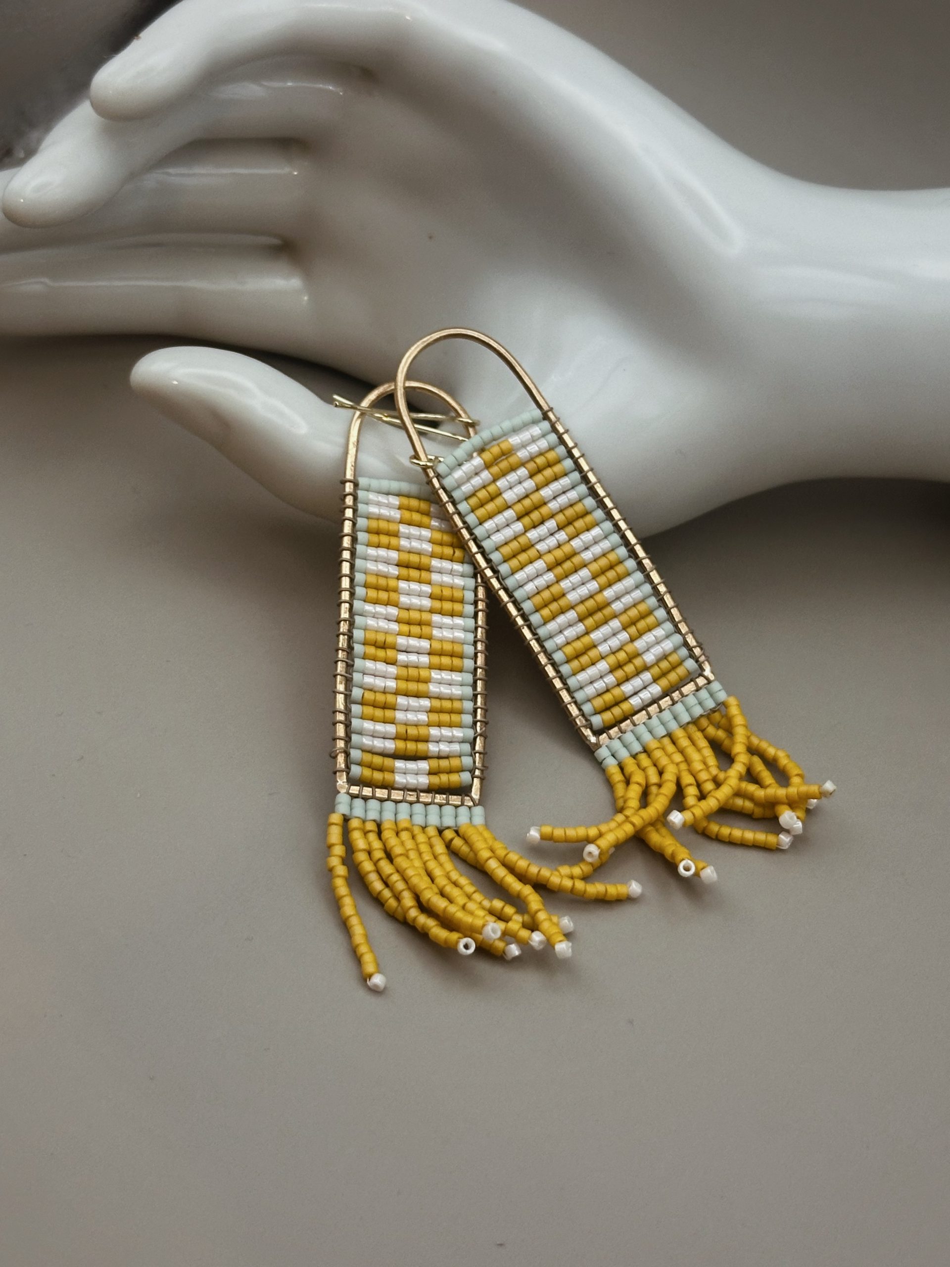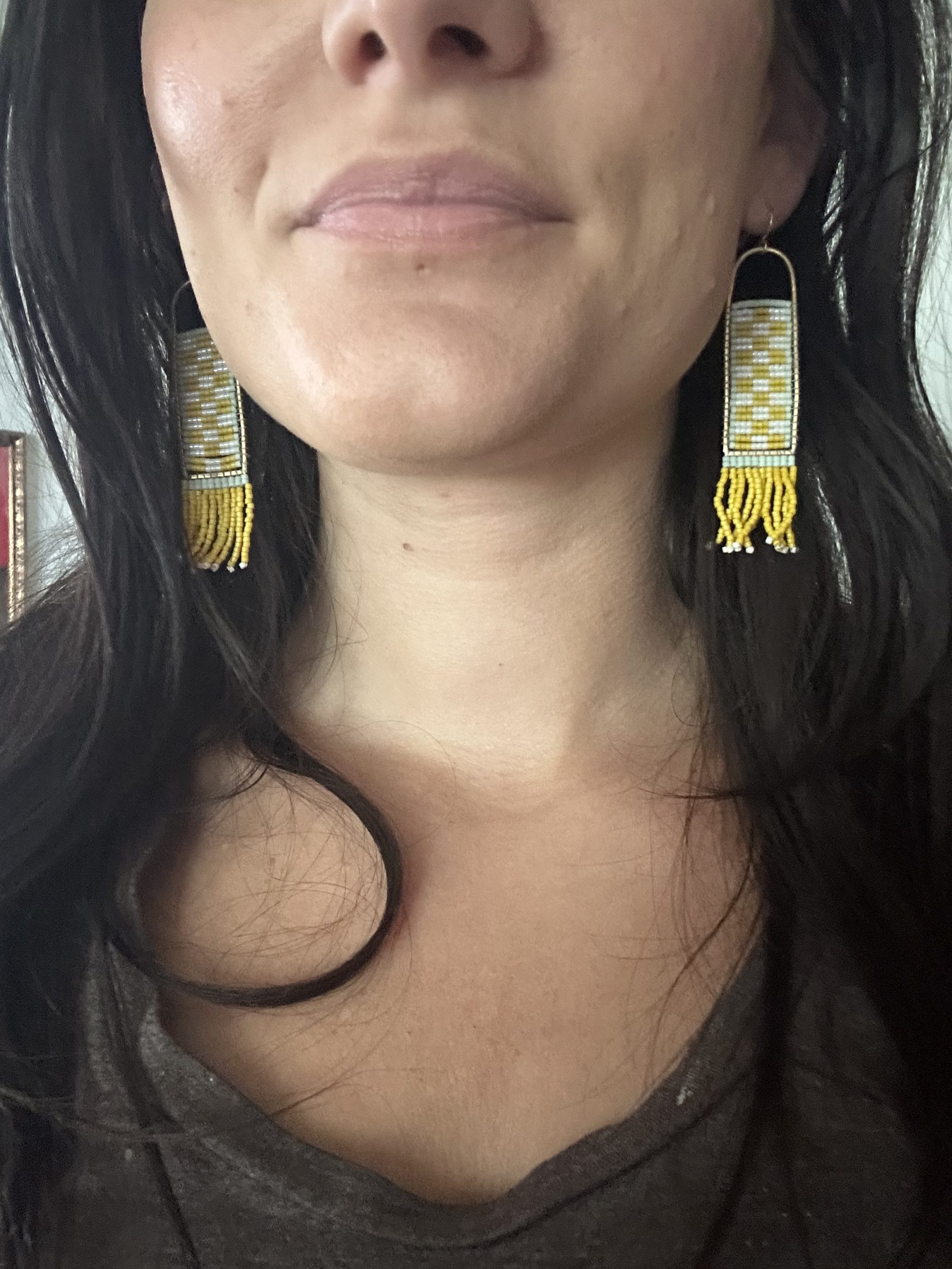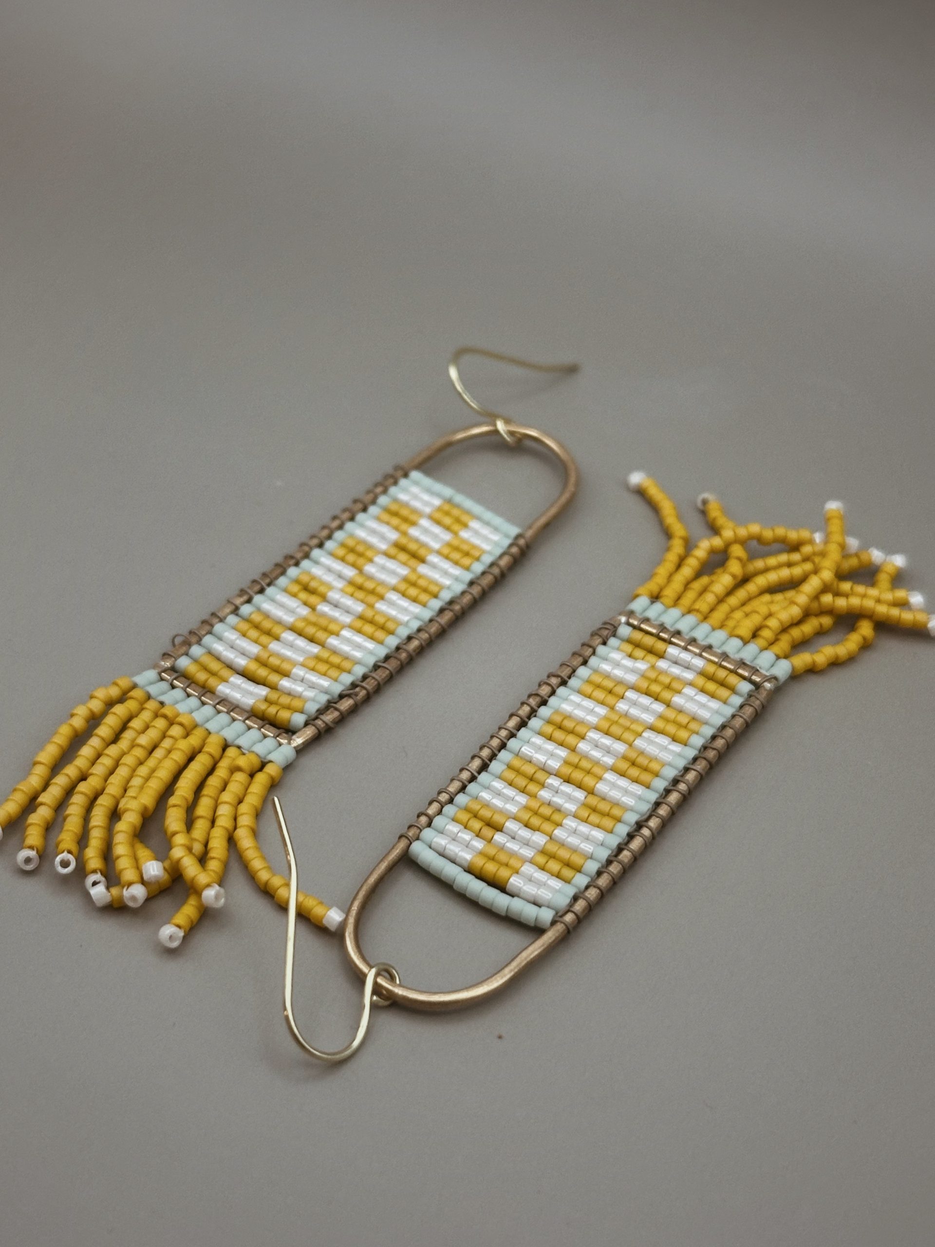 Handwoven with hundreds of tiny glass beads, these earrings are a blend of patience, pattern, and play. Bright canary yellow meets soft mint and crisp white in a geometric checker design that feels both modern and timeless. A handmade brass frame holds the beadwork, finished with cascading fringe that moves gently as you do.